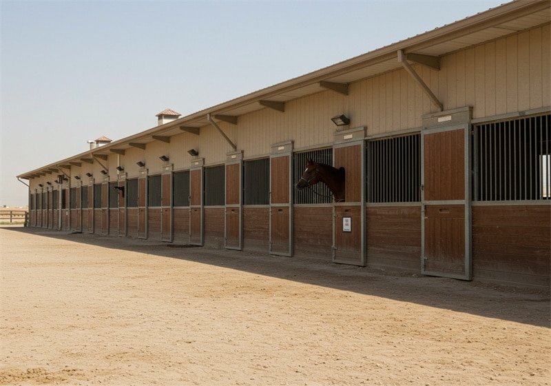 A8: Thoroughbred breeding facilities require specialized breeding sheds, foaling stalls, large grassy paddocks for mares and foals, and often small tracks for early training. Sport horse training facilities, conversely, prioritize large, high-quality arenas (indoor and outdoor with specialized footing), jumping fields, dressage rings, and advanced therapy/recovery areas. While some amenities overlap, the core infrastructure caters to vastly different needs for durable horse stables for all climates for training vs. breeding.