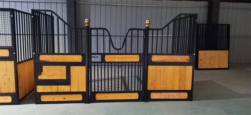 New horse stall fronts featuring black metal frames and light to medium brown wooden infill. The design includes both solid wood sections and vertical metal bars, with some sections having a reddish-orange hue. The stalls appear to have sliding doors, and in the background, there are stacks of colorful packaged materials.